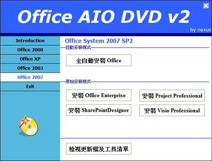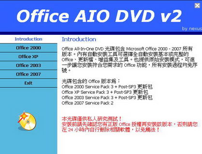 Office All-In-One DVD 光碟包含 Microsoft Office 2000 - 2007 所有版本。內有自動安裝